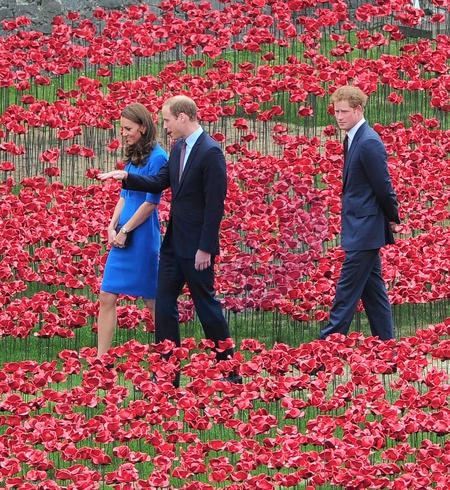 Ksiezna Kate, ksiaze William i ksiaze Harry wsrod ceramicznych makow przy zamku Tower