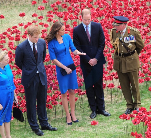 Ksiezna Kate, ksiaze William i ksiaze Harry wsrod ceramicznych makow przy zamku Tower