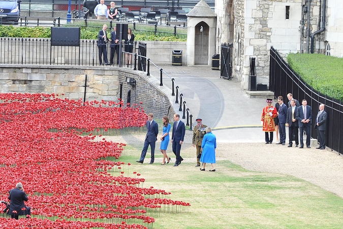Ksiezna Kate, ksiaze William i ksiaze Harry wsrod ceramicznych makow przy zamku Tower