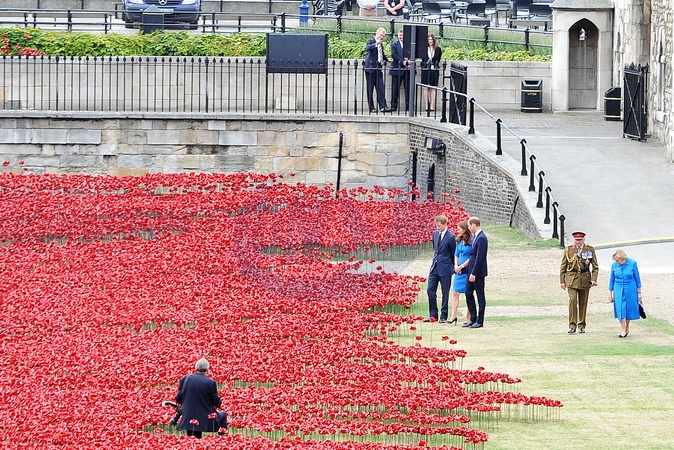 Ksiezna Kate, ksiaze William i ksiaze Harry wsrod ceramicznych makow przy zamku Tower