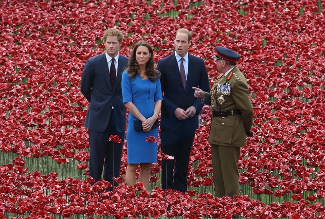 Ksiezna Kate, ksiaze William i ksiaze Harry wsrod ceramicznych makow przy zamku Tower
