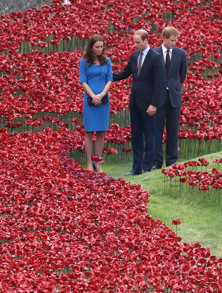 Ksiezna Kate, ksiaze William i ksiaze Harry wsrod ceramicznych makow przy zamku Tower