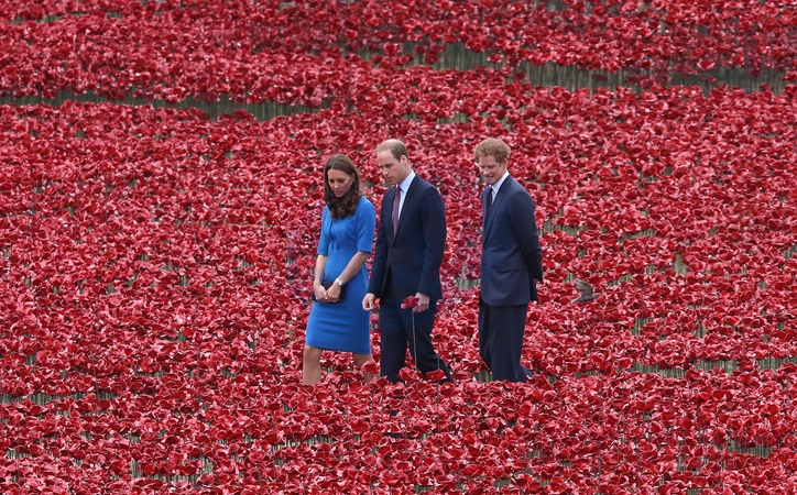 Ksiezna Kate, ksiaze William i ksiaze Harry wsrod ceramicznych makow przy zamku Tower