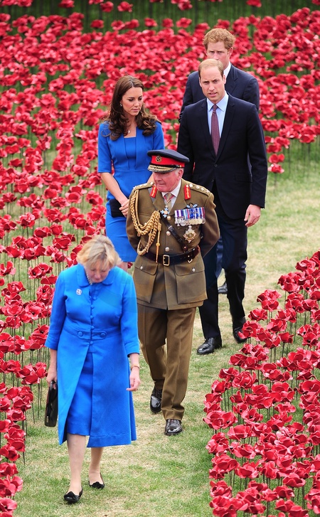Ksiezna Kate, ksiaze William i ksiaze Harry wsrod ceramicznych makow przy zamku Tower