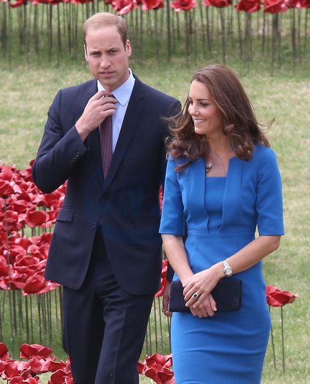 Ksiezna Kate, ksiaze William i ksiaze Harry wsrod ceramicznych makow przy zamku Tower