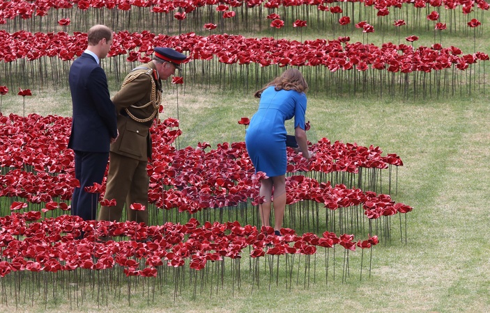 Ksiezna Kate, ksiaze William i ksiaze Harry wsrod ceramicznych makow przy zamku Tower