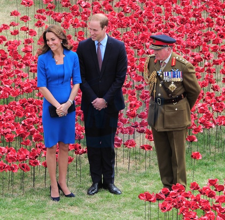 Ksiezna Kate, ksiaze William i ksiaze Harry wsrod ceramicznych makow przy zamku Tower