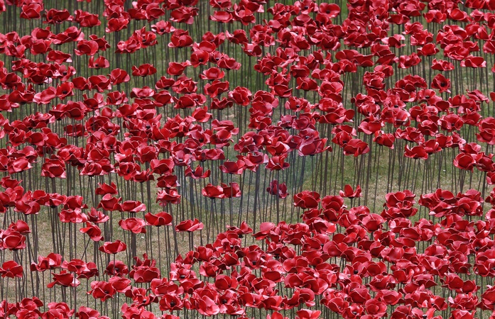 Ksiezna Kate, ksiaze William i ksiaze Harry wsrod ceramicznych makow przy zamku Tower