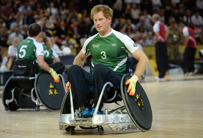 Ksiaze Harry na wozku inwalidzkim podczas gry - Invictus Games 2014