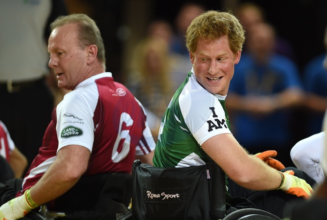 Ksiaze Harry na wozku inwalidzkim podczas gry - Invictus Games 2014