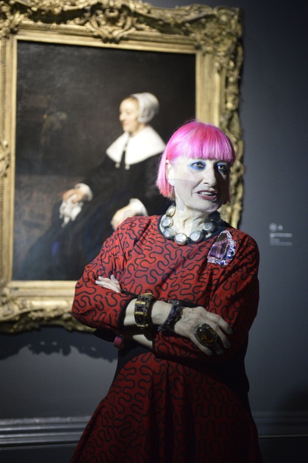 Projektantka mody Zandra Rhodes pozuje w galerii sztuki