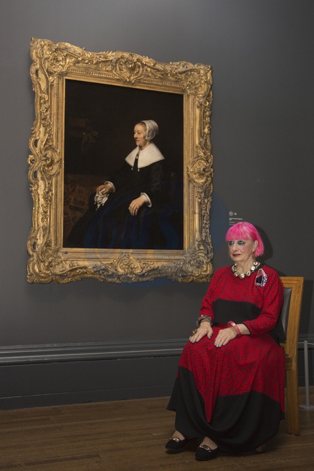 Projektantka mody Zandra Rhodes pozuje w galerii sztuki