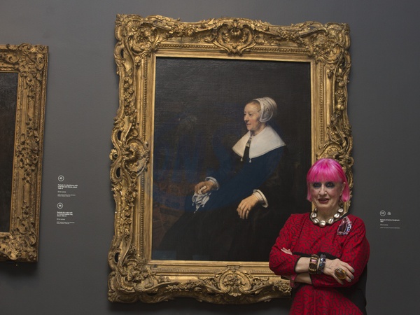 Projektantka mody Zandra Rhodes pozuje w galerii sztuki