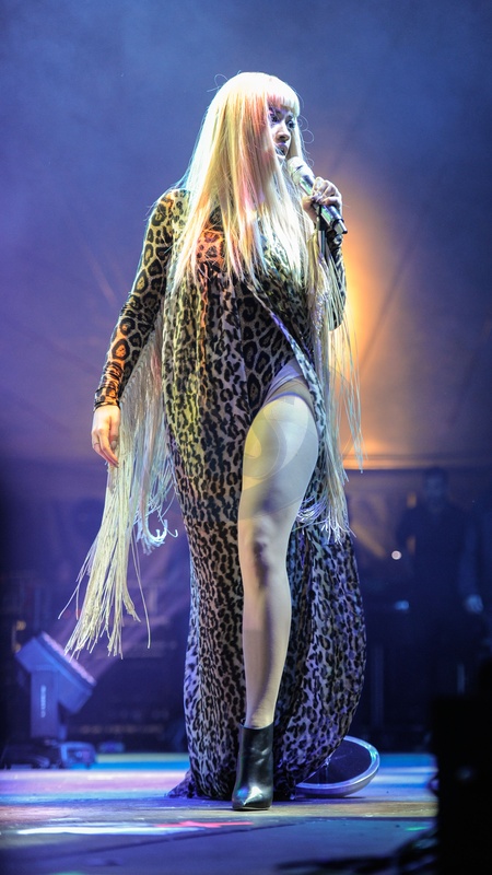 Drapiezna Rita Ora w peruce na scenie w Stafford
