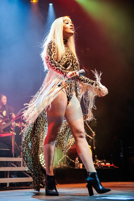 Drapiezna Rita Ora w peruce na scenie w Stafford
