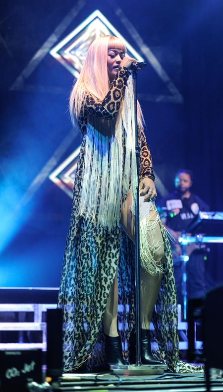 Drapiezna Rita Ora w peruce na scenie w Stafford