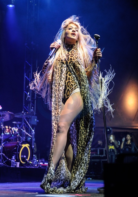 Drapiezna Rita Ora w peruce na scenie w Stafford