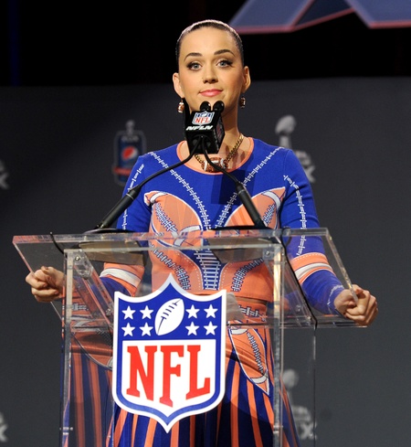 Katy Perry przemawia podczas Pepsi Super Bowl XLIX Halftime show