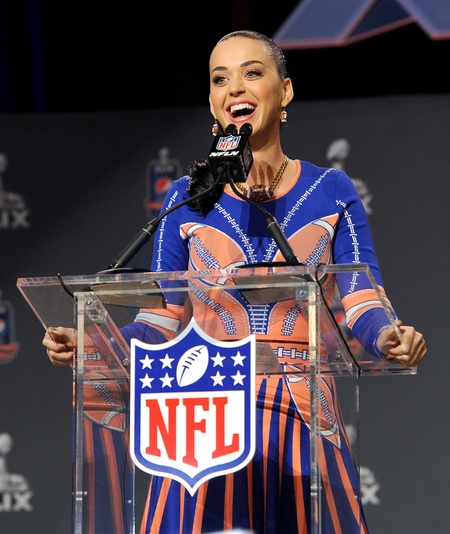 Katy Perry przemawia podczas Pepsi Super Bowl XLIX Halftime show