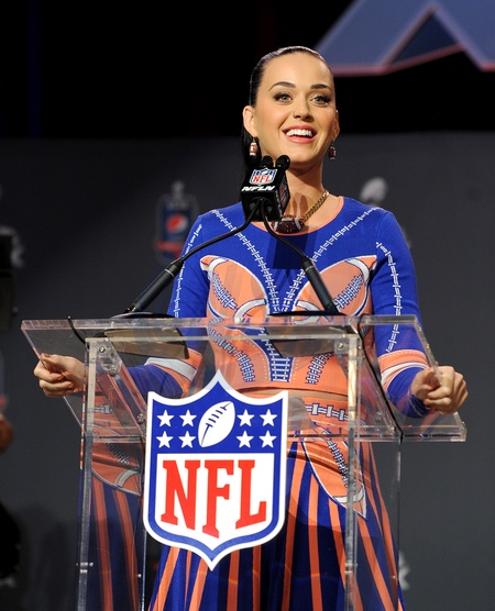 Katy Perry przemawia podczas Pepsi Super Bowl XLIX Halftime show