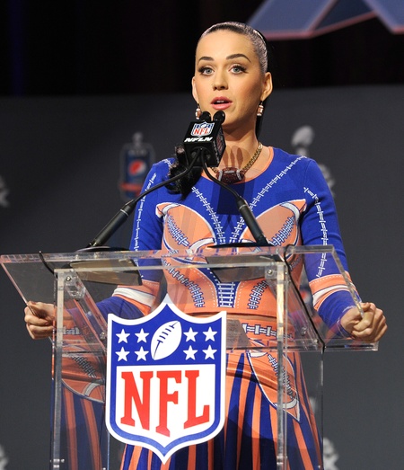 Katy Perry przemawia podczas Pepsi Super Bowl XLIX Halftime show