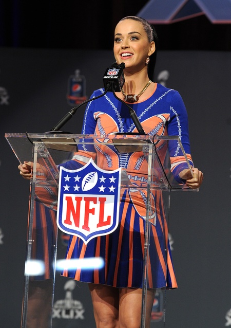 Katy Perry przemawia podczas Pepsi Super Bowl XLIX Halftime show