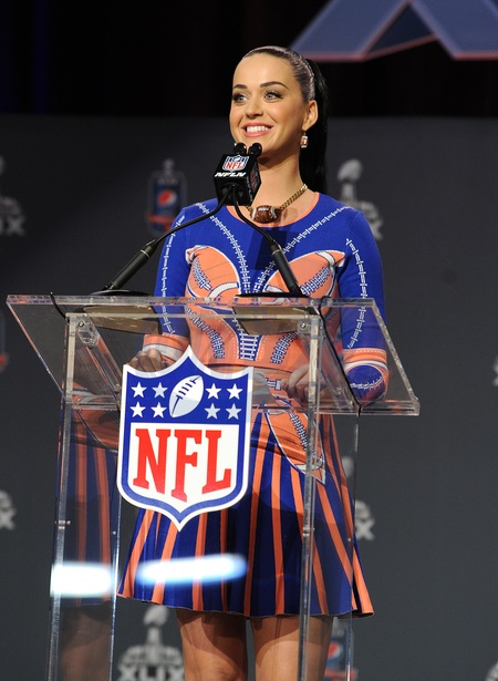 Katy Perry przemawia podczas Pepsi Super Bowl XLIX Halftime show