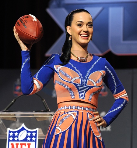 Katy Perry przemawia podczas Pepsi Super Bowl XLIX Halftime show