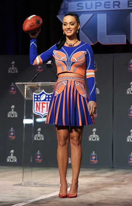 Katy Perry przemawia podczas Pepsi Super Bowl XLIX Halftime show