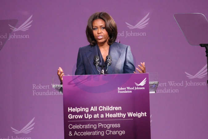Michelle Obama przemawia do studentow w Edward A. Reynolds West Side High School, Nowy Jork