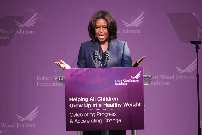 Michelle Obama przemawia do studentow w Edward A. Reynolds West Side High School, Nowy Jork