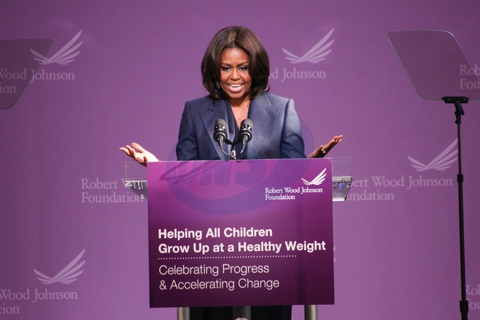 Michelle Obama przemawia do studentow w Edward A. Reynolds West Side High School, Nowy Jork