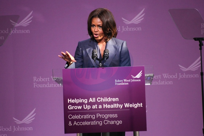 Michelle Obama przemawia do studentow w Edward A. Reynolds West Side High School, Nowy Jork