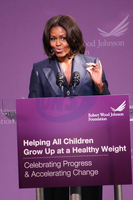 Michelle Obama przemawia do studentow w Edward A. Reynolds West Side High School, Nowy Jork