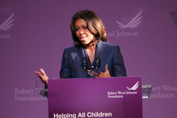 Michelle Obama przemawia do studentow w Edward A. Reynolds West Side High School, Nowy Jork