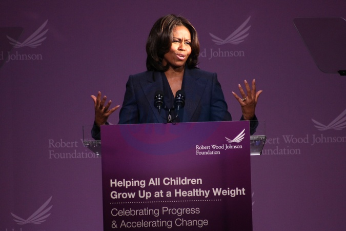 Michelle Obama przemawia do studentow w Edward A. Reynolds West Side High School, Nowy Jork