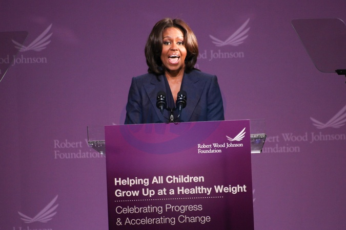Michelle Obama przemawia do studentow w Edward A. Reynolds West Side High School, Nowy Jork