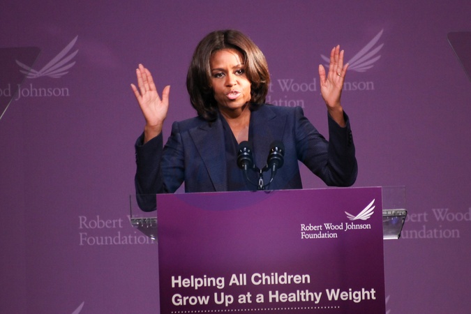 Michelle Obama przemawia do studentow w Edward A. Reynolds West Side High School, Nowy Jork