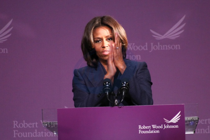 Michelle Obama przemawia do studentow w Edward A. Reynolds West Side High School, Nowy Jork