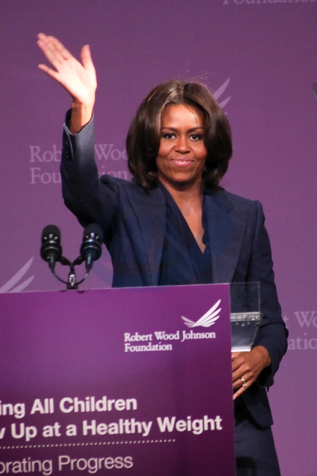 Michelle Obama przemawia do studentow w Edward A. Reynolds West Side High School, Nowy Jork