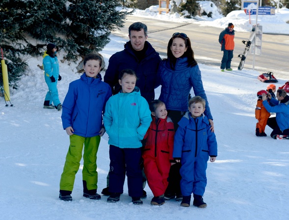 Ksiaze Frederik i Ksiezna Mary z dziecmi na sniegu w Szwajcarii