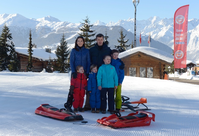 Ksiaze Frederik i Ksiezna Mary z dziecmi na sniegu w Szwajcarii
