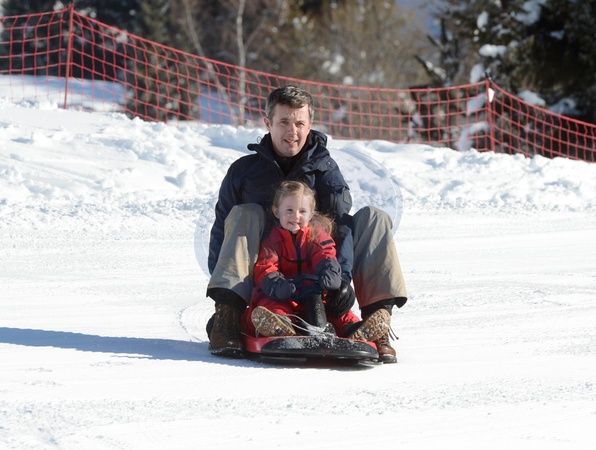 Ksiaze Frederik i Ksiezna Mary z dziecmi na sniegu w Szwajcarii