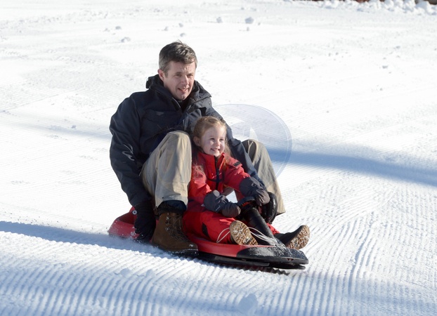 Ksiaze Frederik i Ksiezna Mary z dziecmi na sniegu w Szwajcarii