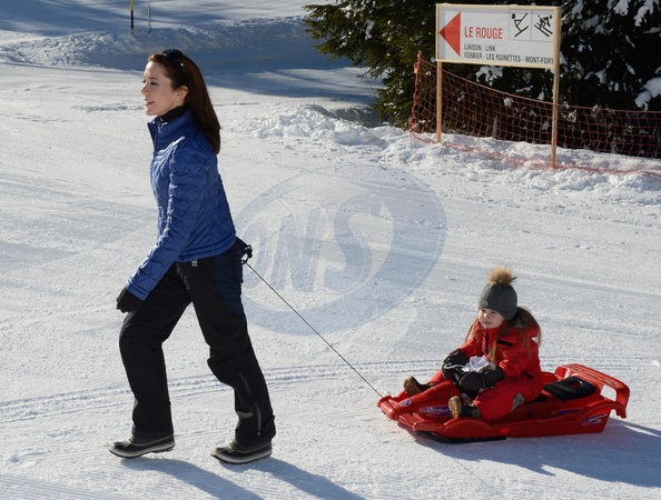 Ksiaze Frederik i Ksiezna Mary z dziecmi na sniegu w Szwajcarii