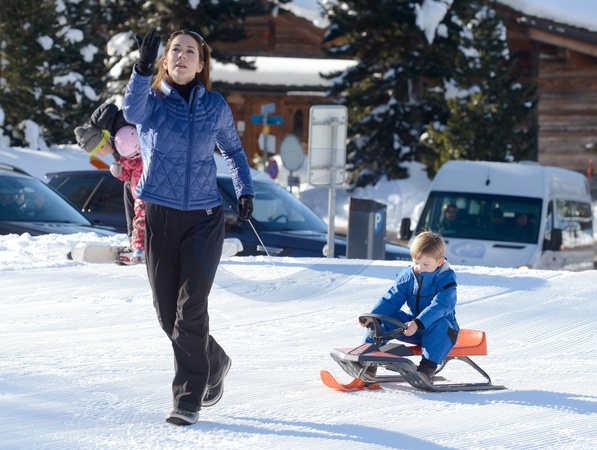 Ksiaze Frederik i Ksiezna Mary z dziecmi na sniegu w Szwajcarii