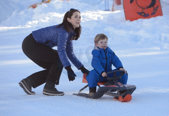 Ksiaze Frederik i Ksiezna Mary z dziecmi na sniegu w Szwajcarii