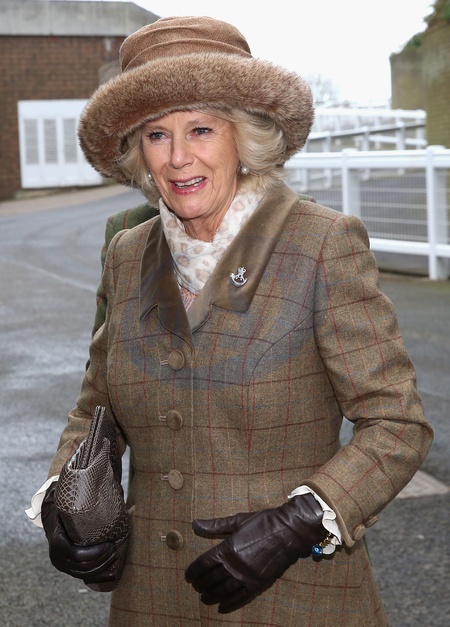 Ksiezna Camilla w kapeluszu z futerkiem na Royal Artillery Gold Cup