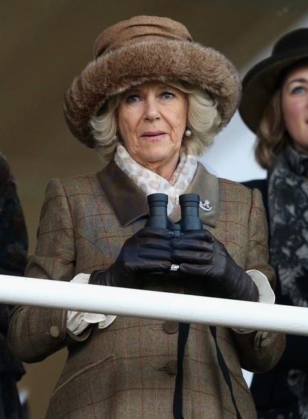 Ksiezna Camilla w kapeluszu z futerkiem na Royal Artillery Gold Cup