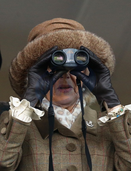 Ksiezna Camilla w kapeluszu z futerkiem na Royal Artillery Gold Cup